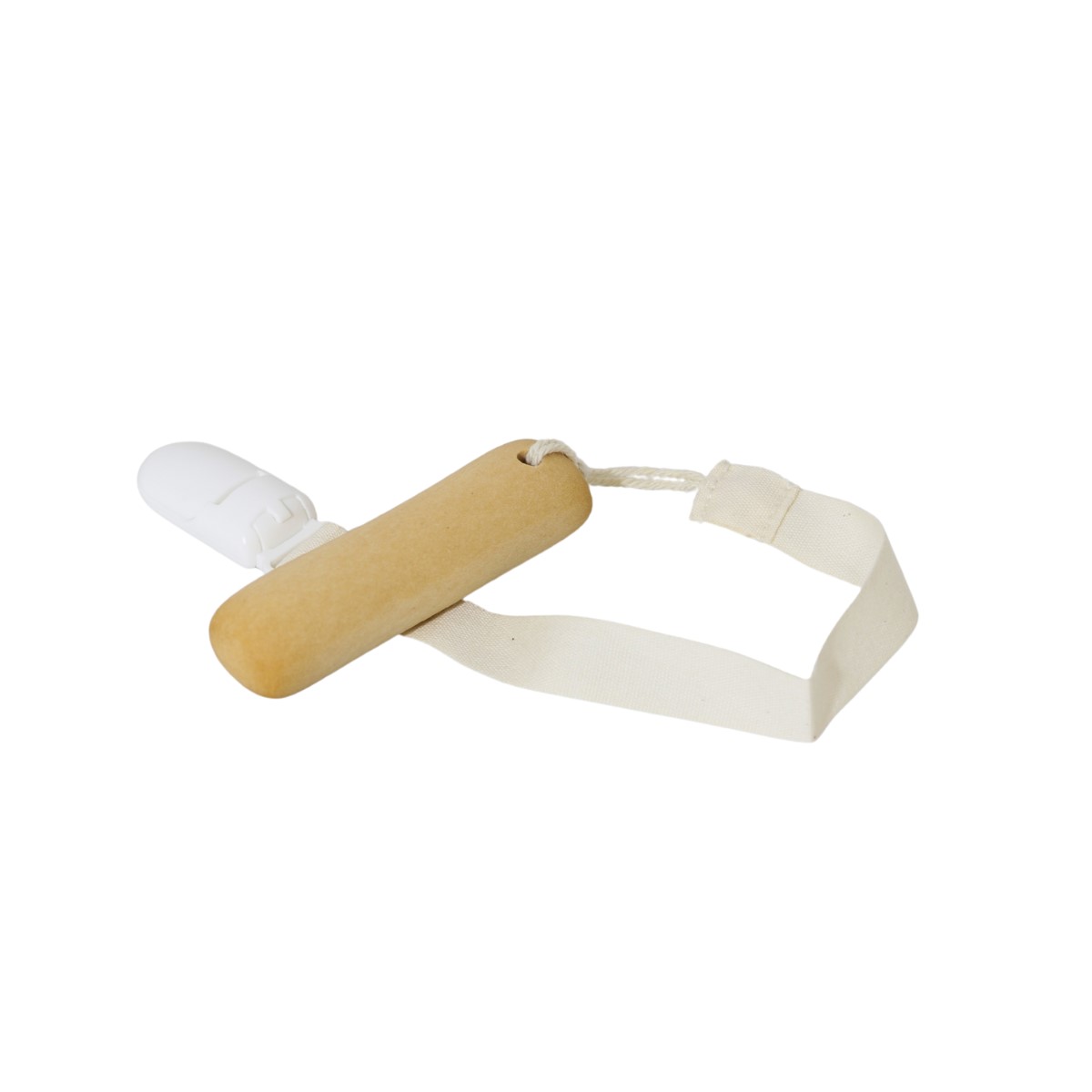 The Special Safety Clip secures the Nom-Nom to the baby's clothes, making it easy to use and minimizing the need for cleaning or picking up dropped teethers.