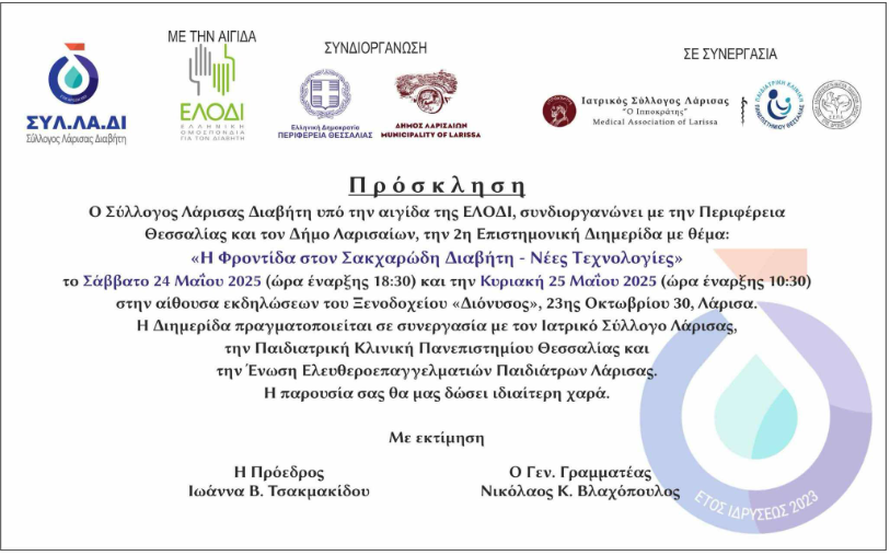 Συμμετέχουμε με ενημερωτικό περίπτερο στη 2η Επιστημονική Διημερίδα με θέμα: «Η Φροντίδα στον Σακχαρώδη Διαβήτη – Νέες Τεχνολογίες», που διοργανώνει ο Σύλλογος Λάρισας Διαβήτη, υπό την αιγίδα της ΕΛΟΔΙ και σε συνδιοργάνωση με την Περιφέρεια Θεσσαλίας και τον Δήμο Λαρισαίων.